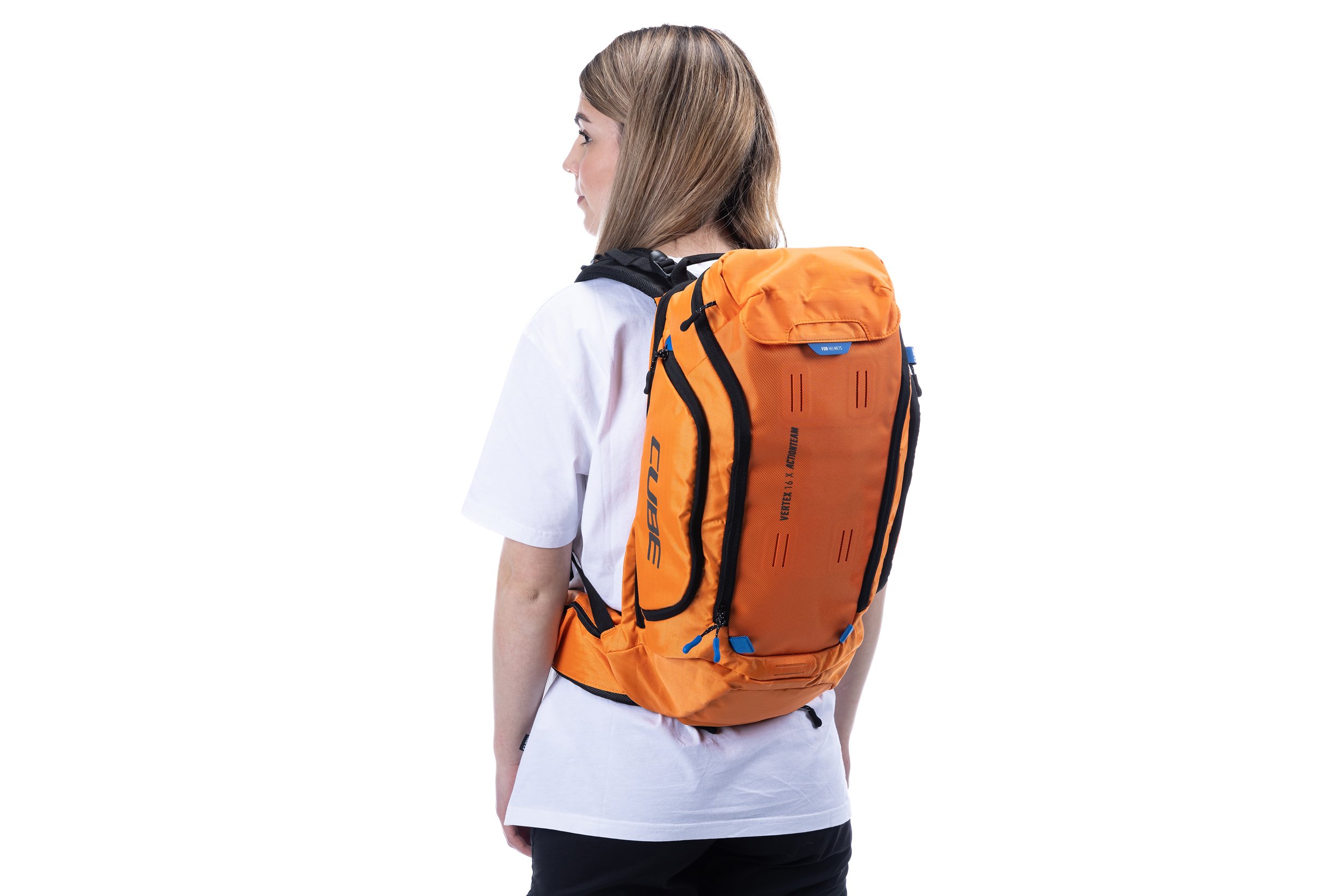 Enduro fans listen up! The VERTEX 16 X Actionteam is our high-class backpack that's absolutely rammed full of practical features. An optimal fit courtesy of ergonomic shoulder straps, hip straps and CUBE's own NF Ergonomics back system developed in-house adds up to a backpack that stays put no matter how hard you shred. We also added padding and ventilation so your back stays comfortable and fresh. The VERTEX 16 includes a SAS-TEC LB-L protector weighing in at a feather-light 150 g. We also included a protector strap, helmet carrier, goggle compartment and rain cover for maximum practicality. Internal compartments, a hip pocket, a smartphone pocket and two side tool compartments keep everything organised while you session the trails. And we also made it hydration system-compatible because that's how we roll! What's more: instead of a standard black lining, we used a contrasting colour to make it easier and faster to find what you need.