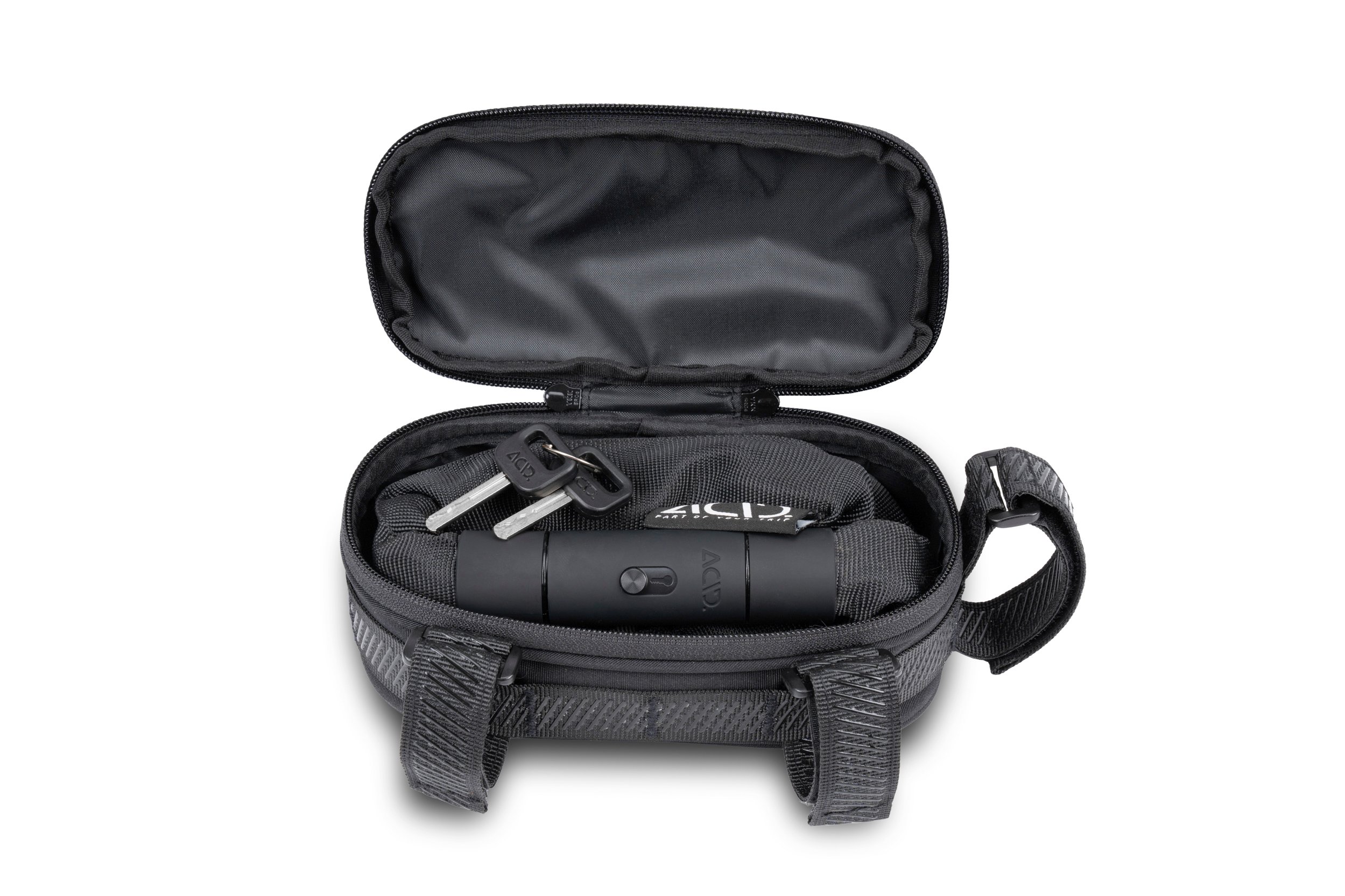Safely transport any ACID CORVID chain lock in the ACID Accessory Bag CORVID with an abrasion-resistant outer. The lock bag attaches virtually anywhere on the frame using non-slip straps and the flexible MOLLE daisy chains. Reflective details improve visibility in low-light conditions.