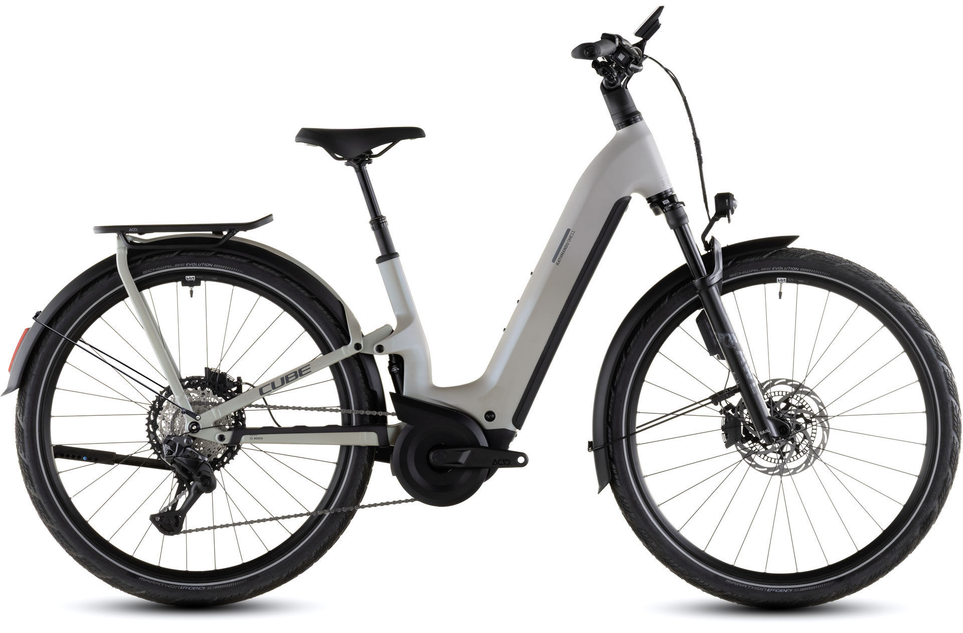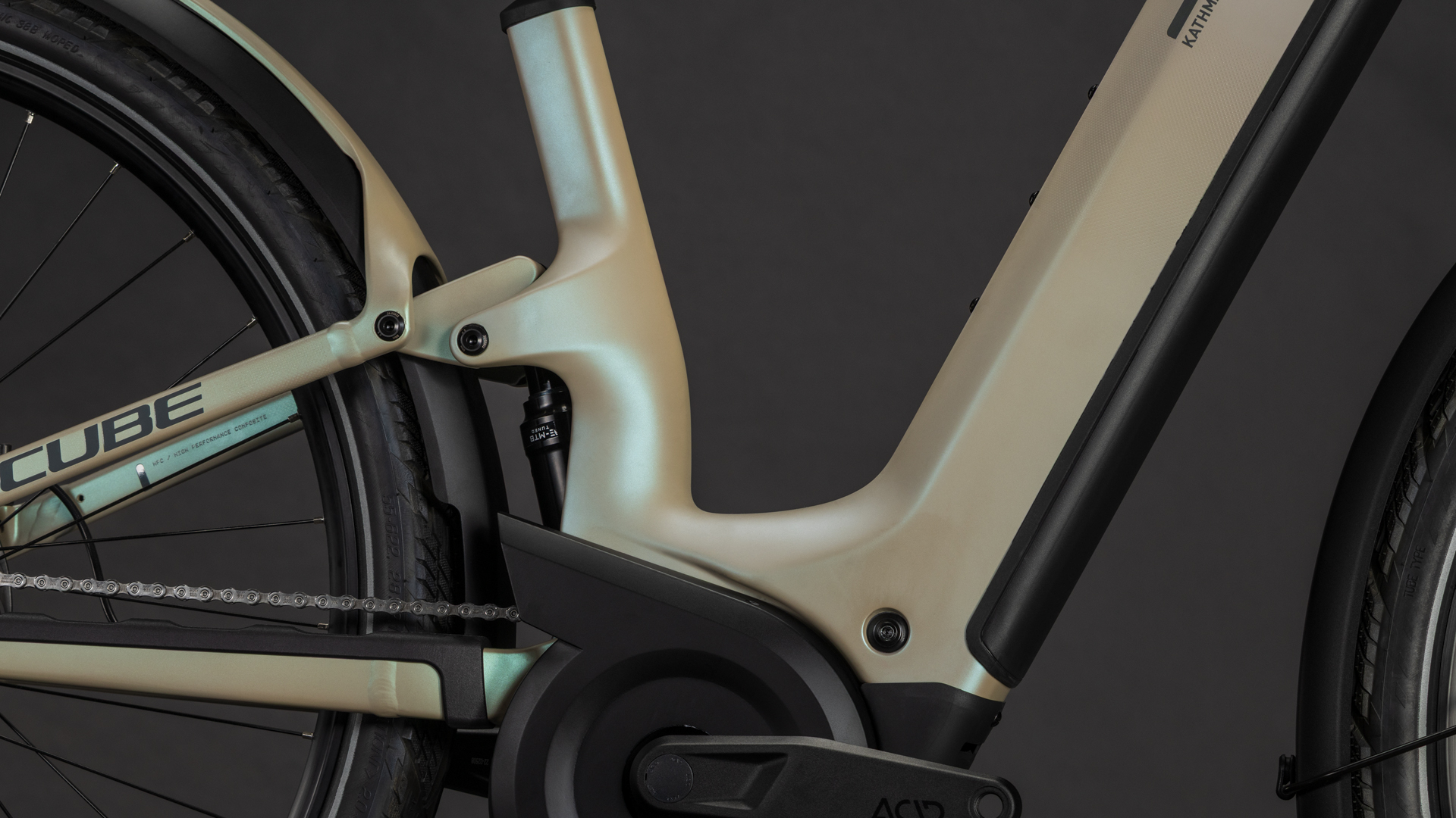 Combining everything we know about full suspension and rugged touring bikes in a single frame, the Kathmandu Hybrid ONE11 HPC from CUBE represents a new breed of Bosch-powered adventure bikes. The accessible Easy Entry design makes use of a sophisticated High Performance Carbon front end, housing a powerful Bosch CX drive and 800Wh PowerTube battery. There's 100mm of rear-wheel travel from an incredibly neatly sited trunnion-mount shock, while the IC 3.0 rear carrier is incorporated into the aluminium rear triangle. Integrated Cable Routing complements the frame's clean looks, the derailleur hanger is UDH-compatible, and a chain guard is fitted as standard. It's all there so that you can ride further... in comfort.