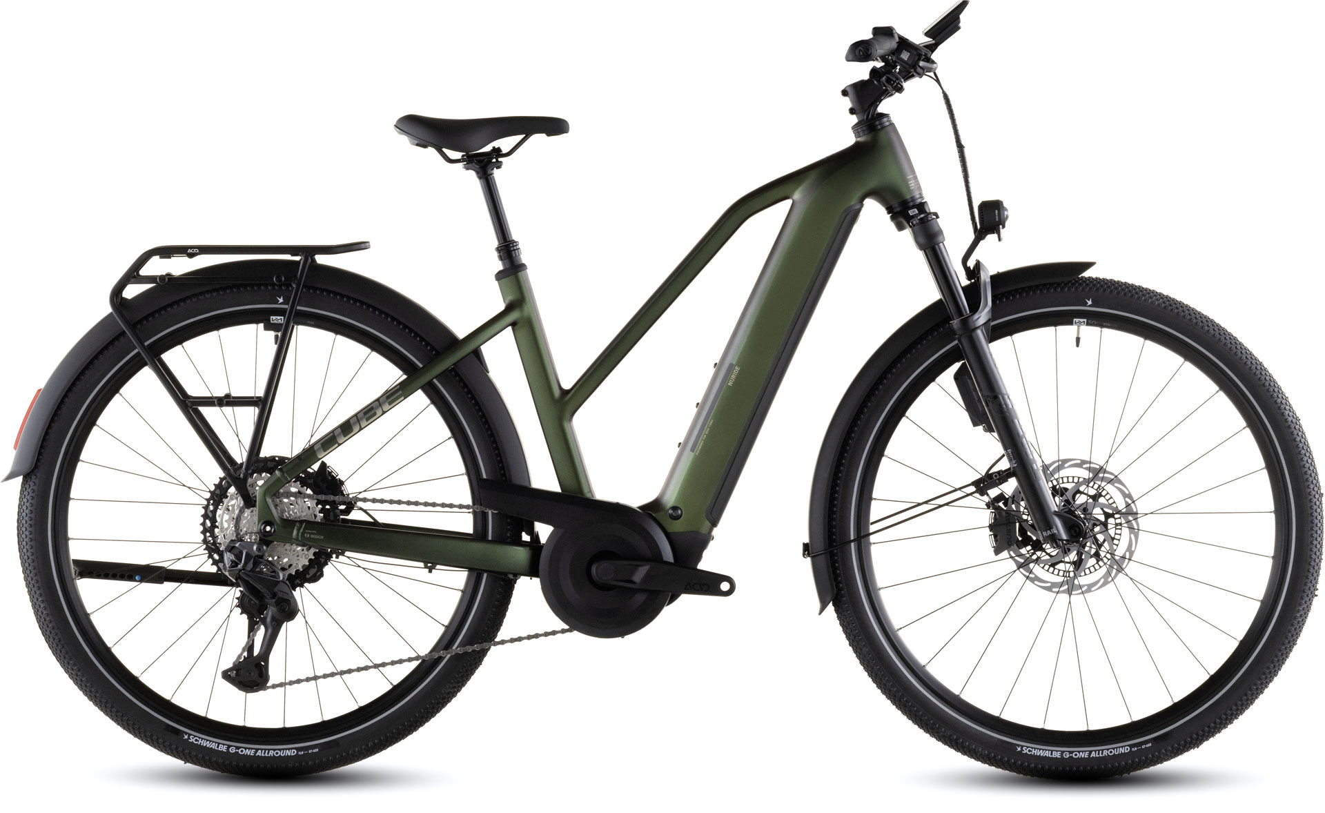 The Nuride Hybrid's Trapeze frame's traditional looks are familiar, but it's hiding a wealth of innovation under its elegant exterior. Designed to accommodate a 100mm suspension fork for extra comfort and control, it also features generous tyre clearances – even with the supplied mudguards. Integrated cables complement the frame's clean looks and the 800Wh PowerTube battery and Bosch CX drive are neatly incorporated into the frame structure. There's an integrated chain guard and, with the included mudguards, lights and kickstand plus the sturdy Semi Integrated Carrier 2.0, you've everything you need for two-wheeled adventures.