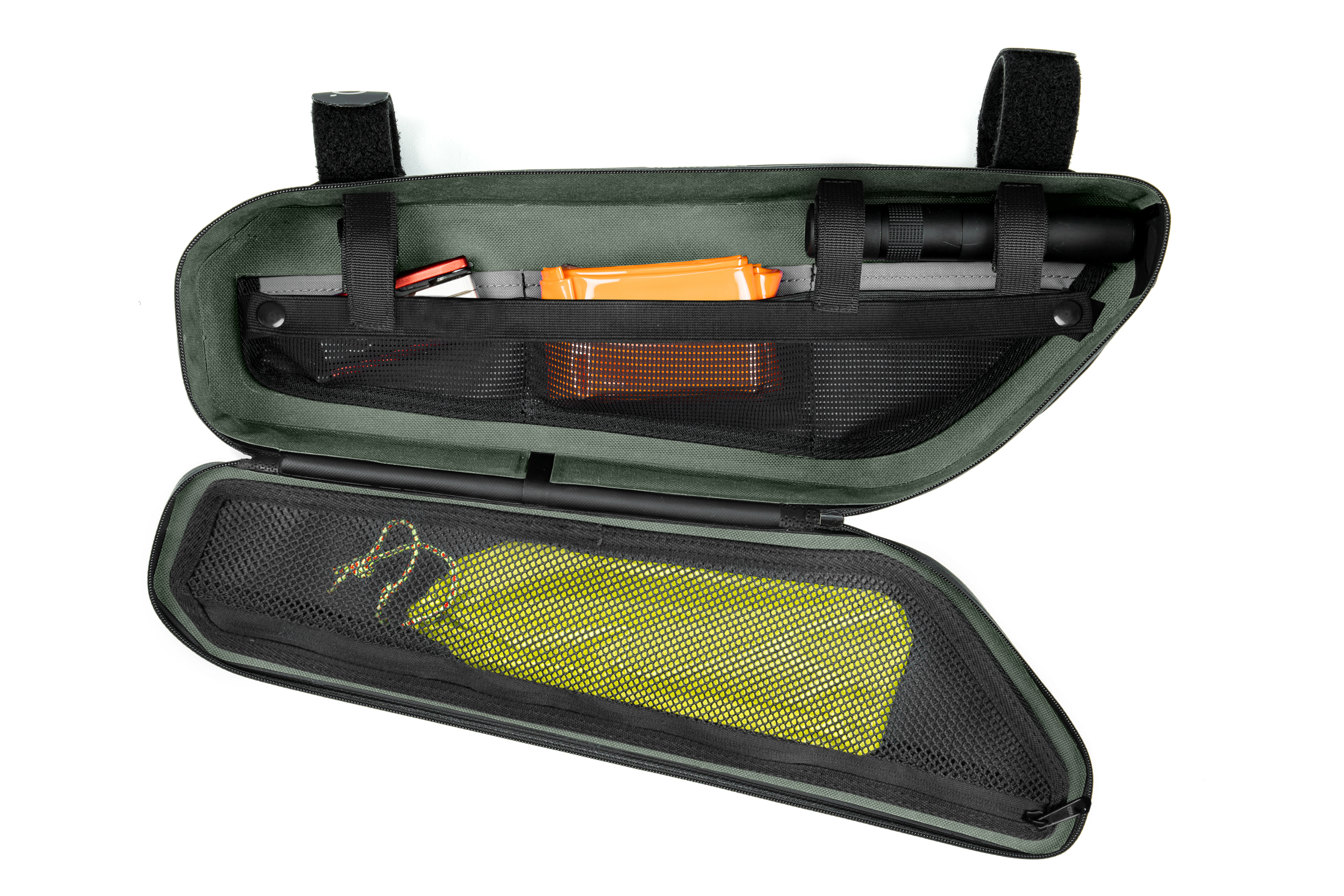 The entire PACK PRO bikepacking series was developed in cooperation with experienced bikepackers. The PRO 2 is the smallest frame bag in this series. Its PVC-free, welded construction is waterproof and the outer is constructed from durable material that's easy to care for. The MOLLE system offers flexibility in spades, allowing the bag to attach easily to a wide variety of frames. Side zip pockets with smooth-running zips are perfect for stashing small items. We put just as much attention into designing the interior: multiple compartments are perfect for organising tools, spares and more, while the colour-contrasting material makes it easy to find everything. Reflective details improve visibility on the roads in low-light conditions.
