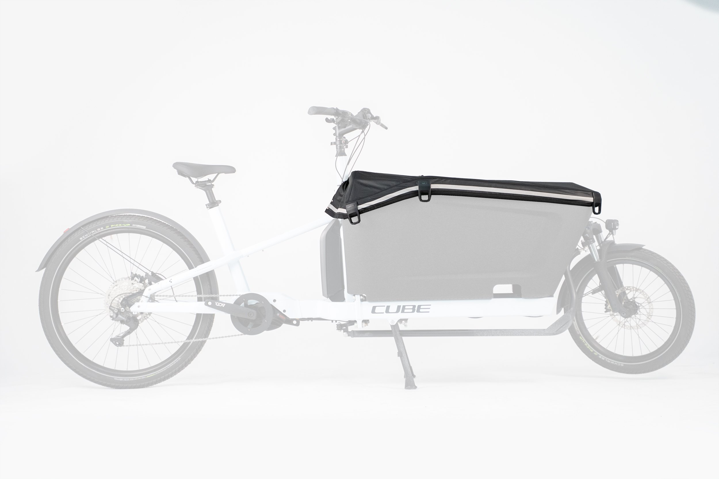 No garage? No problem! The CUBE Boxcover has you covered. Keeps water and dirt out of the cargo box of your CUBE CARGO HYBRID with CUBE Seat CARGO. Includes a section that opens and rolls back, so the Boxcover can do double duty as a weather shield when transporting the kids in bad weather.